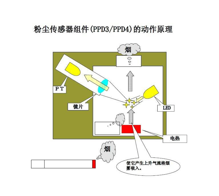 如上图所示,(PPD42NS动作原理)pm2 5传感器动作原理,雾霾传感器内置发热装置,只需要垂直向上安装,不需要任何的吸气,泵装置等,此原理