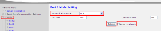 3) 模式设置:模式设置主要有通信模式设置,通信模式应该设置为MCP模式,对于Data Port和Command Port采用默认即可,如下图